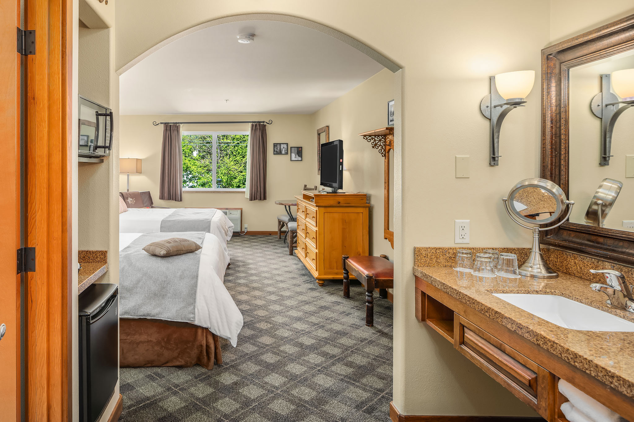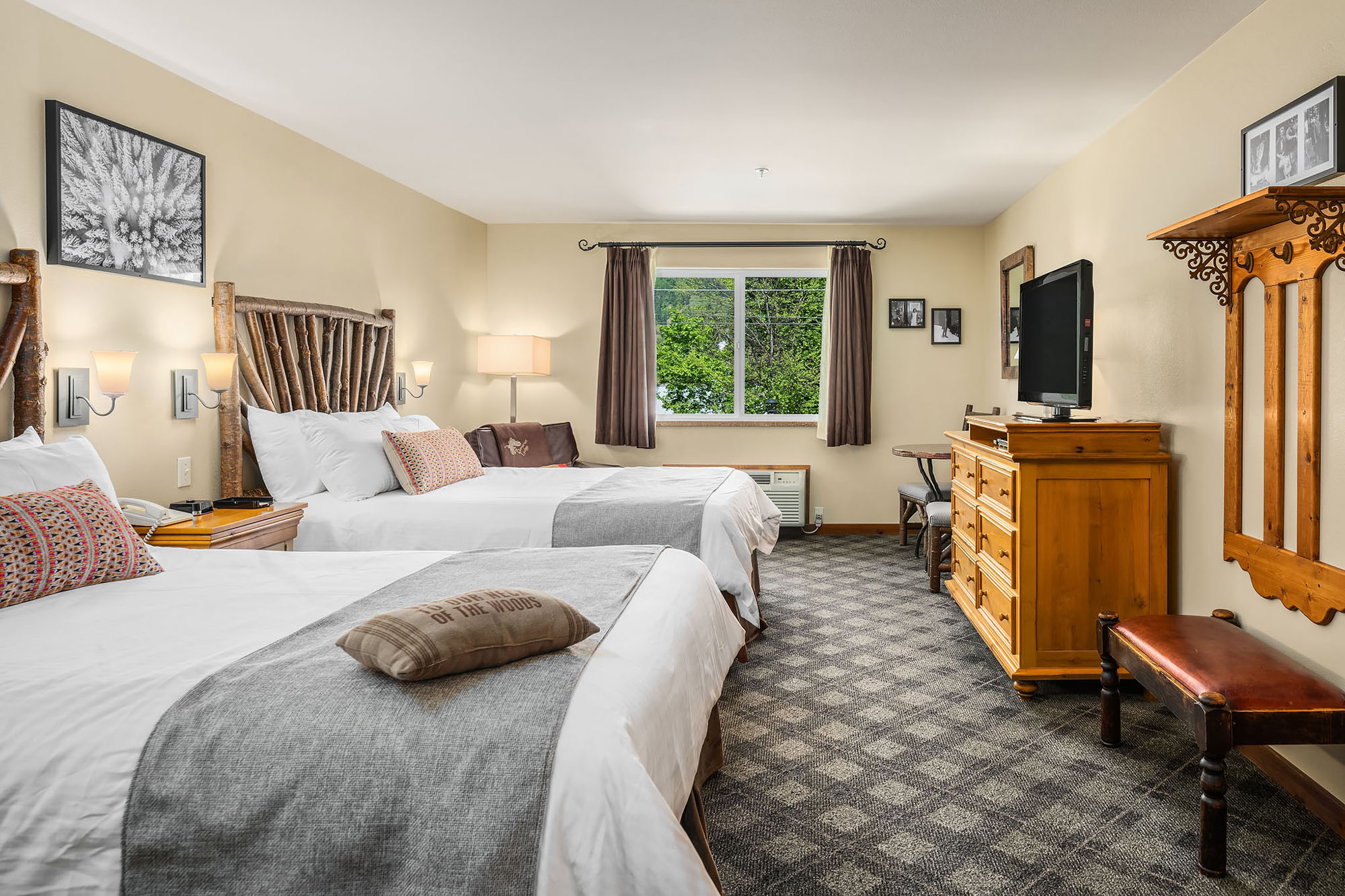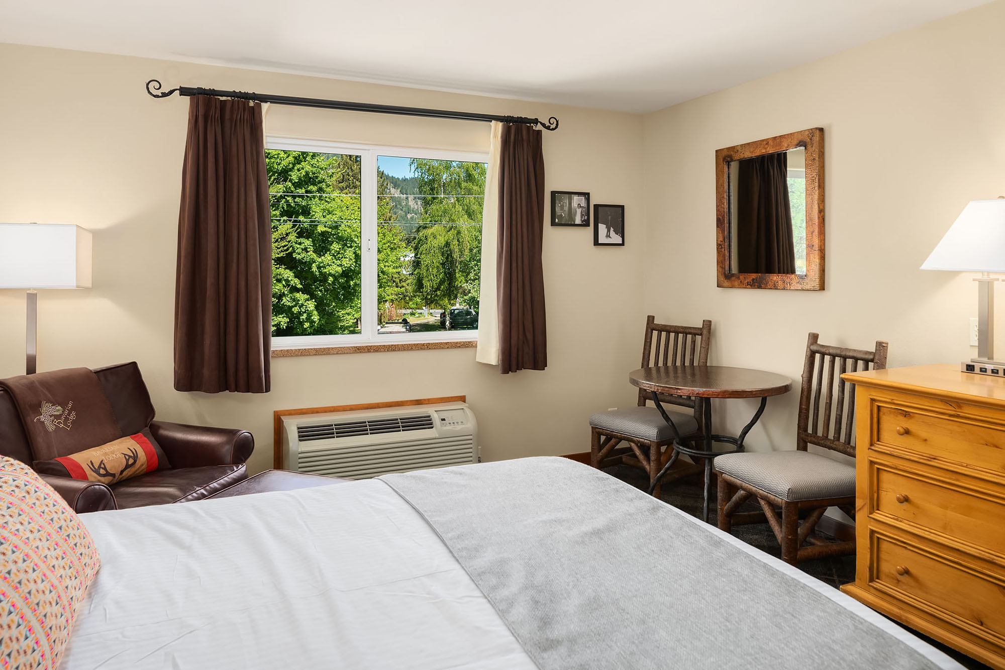 Located on the peaceful rear side of the building, this spacious room features two plush queen beds and large windows framing the Cascade Mountains. Ideal for families or friends, it’s a relaxing alpine retreat after a day in Leavenworth.