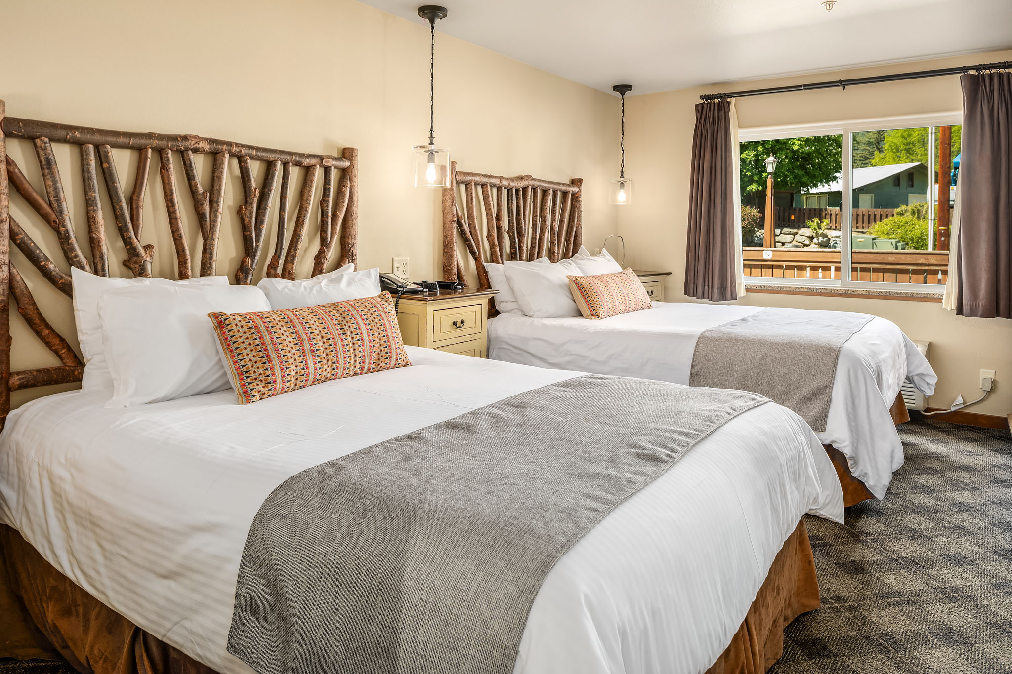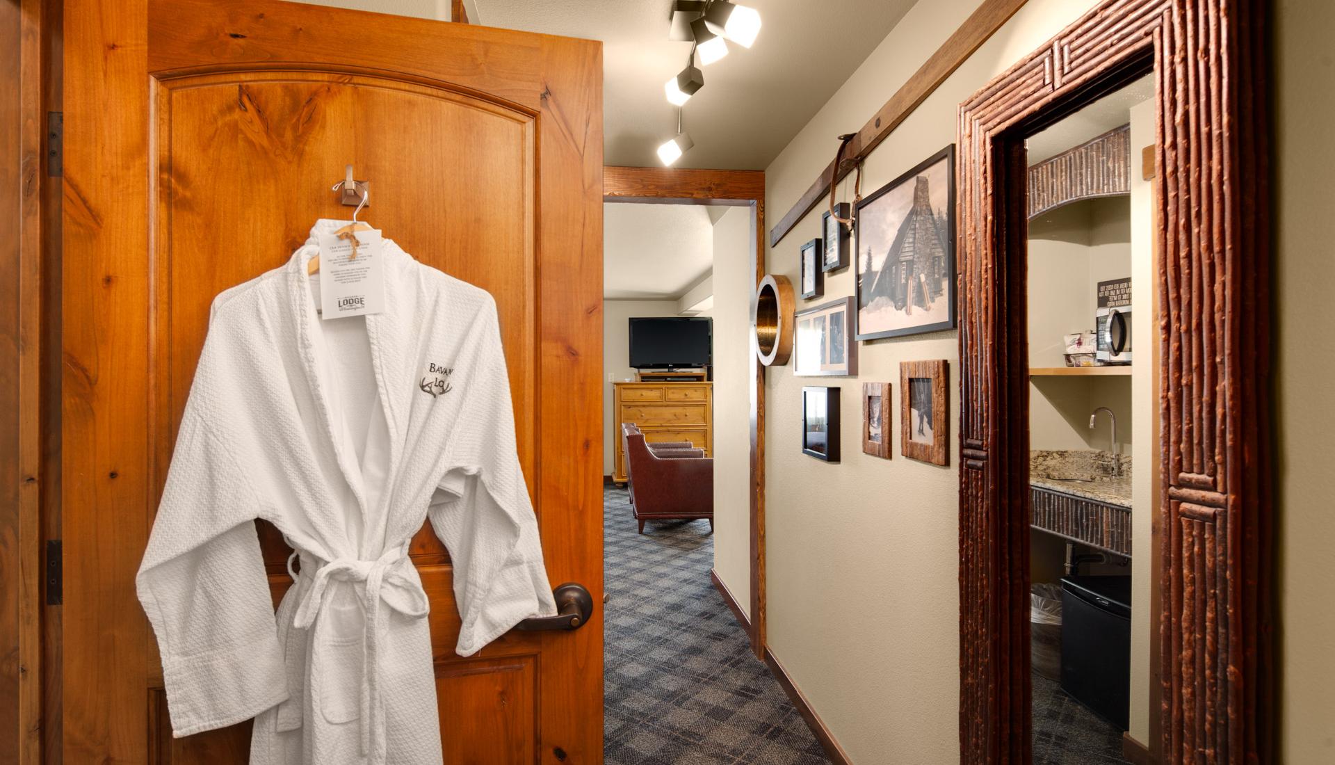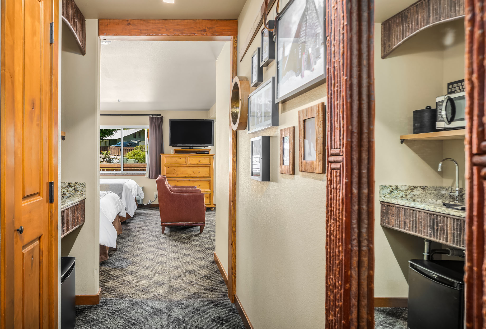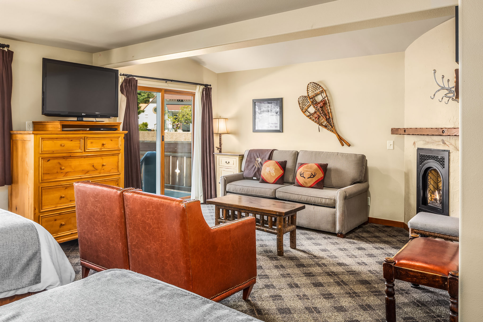 This ground-floor suite features two queen beds, a queen sleeper sofa, and a cozy gas fireplace. Step out to a private patio with mountain views and enjoy the open layout ideal for families or groups unwinding after a day in Leavenworth.